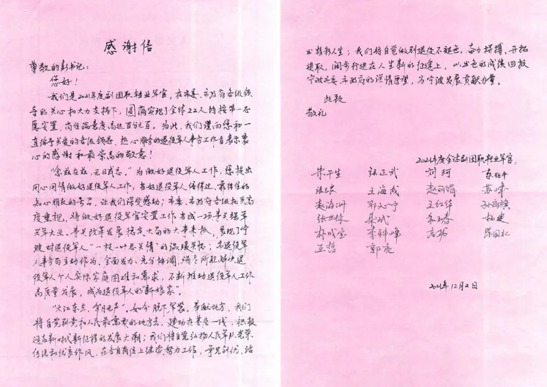 2021年宁波市共接收安置团职以下转业军官280人、安排工作退役士兵147人、军休干部90人、随调家属1人,安置工作成色更足。正团职、副团职、营以下转业军官和退役士兵等安置对象分别给市、区(县)两级政府集体赠送锦旗5面、联名感谢信1封,个人锦旗2面、感谢信几十封,驻地军、师两级部队给市政府赠送锦旗2面,省委常委、市委书记彭佳学做出批示。